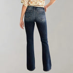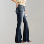 Der markante Doppelknopf-Verschluss sorgt für einen Hauch von Raffinesse und sichert die mittelhohe Silhouette auf eine Weise, die sowohl trendy als auch sicher ist. Die Whiskering-Details und die ausgestellten Beine bringen den Vintage-Look in die moderne Modeszene und sorgen dafür, dass Sie mühelos auffallen.