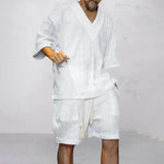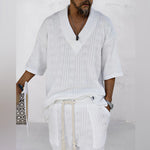 Das Strickmaterial ist leicht und schnelltrocknend und macht dieses Set zum idealen Begleiter für jedes Outdoor-Abenteuer oder einen entspannten Tag. Das passende Hemd und die Shorts sorgen für einen koordinierten Look, ohne dass man sich darum kümmern muss. Dieses Set ist perfekt für Männer, die ein stilvolles und einfach zu tragendes Sommeroutfit für den Strand, den Park oder andere Orte suchen.